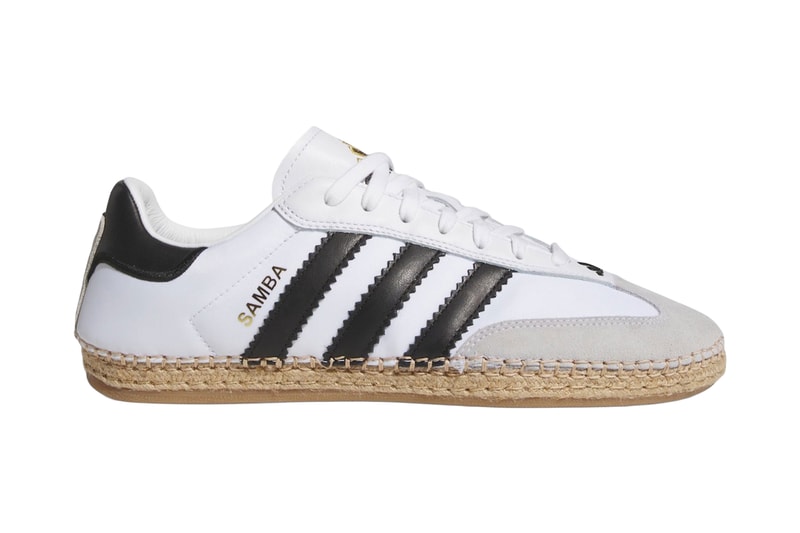 The adidas Samba Espadrille is a modern twist on the beloved T-toe sneaker. With a jute-wrapped midsole, this shoe is perfect for those hot summer days. It comes in a timeless white and black colorway, making it a versatile choice for any outfit. The suede heel is adorned with a luxurious CLOT logo, while the updated Gazelle Indoor outsole adds a fresh touch to the original Samba design.
